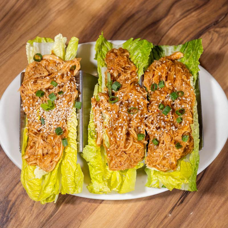 Shredded chicken in a sesame chicken sauce served in romaine lettuce with sesame seeds and scallions