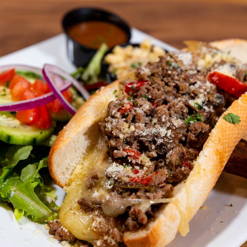 Sliced steak with sautéed mushrooms, onions, peppers, cheese sauce. Served with fries and macaroni salad